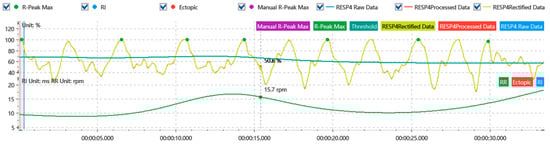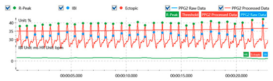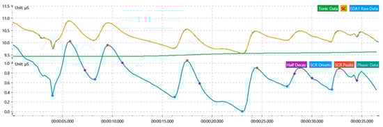 The raw signal recordings from physiological sensors are susceptible to noise, artifacts, measurement gaps, and biases. Therefore, preprocessing the raw data to filter noise and remove artifacts is crucial for obtaining stable and reliable physiological signals. For the skin electrical signal, a sliding mean was used to smooth and denoise the signal, and it was filtered using a 5 Hz high-pass filter. Finally, SC was extracted from the time-domain analysis (as shown in Figure 4). For the respiratory signal, the moderate wavelet denoising technique was used, and a low-pass filter with a cutoff frequency of 20 Hz was used for the filtering. Finally, RESP was extracted from the time-domain analysis (as is shown in Figure 5). For the blood volume pulse signal, moderate wavelet denoising was applied, followed by filtering the signal with a 50 Hz band-stop filter, and finally extracting HR from time-domain analysis (as shown in Figure 6).