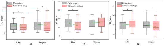 Comparison of SC_Mean, AVRESP, and HR_Mean during the stimulation and calm stage under different preferences. Green line is the average value of the two groups. (a) Comparison of SC_Mean during the stimulation and calm stage. (b) Comparison of AVRESP during the stimulation and calm stage. (c) Comparison of HR_Mean during the stimulation and calm stage. * p < 0.05.
