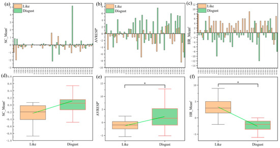 Comparison of individual SC_Mean’, AVRESP’, and HR_Mean’ in “like” and “disgust” states. (a–c) Variation values of 36 samples in “like” and “disgust” states, where the abscissa represents the number of the 36 samples selected. (d–f) Statistical chart of 36 samples in “like” and “disgust” states. (a) corresponds to (d) and so on. Green line is the average value of the two groups. * p < 0.05.