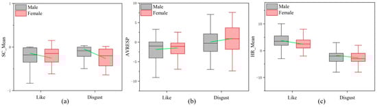 In the “like” state, the SC change trend in the males is less than that in the females (the arithmetic mean of the SC_Mean’ in the male samples is −0.142, and the arithmetic mean of the SC_Mean’ in the female samples is −0.253; as shown in Table 2 and Figure 9a), while the RESP change trend is greater than that in the females (the arithmetic mean of the AVRESP’ in the male samples is −1.877, and the arithmetic mean of the AVRESP’ in the female samples is −1.487; as shown in Table 3 and Figure 9b). The HR change trend is greater than that in the female samples (the arithmetic mean of the HR_Mean’ in the male samples is 3.750, and the arithmetic mean of the HR_Mean’ in the female samples is 2.404; as shown in Table 3 and Figure 9c). However, there is no statistically significant difference between the above signal change values.
