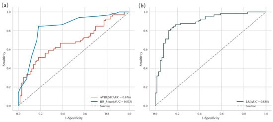 This study used the SK-Learn toolkit (v1.2.2) and the PyCharm (v2022.2.3) interpreter to build a logistic regression model. We used 144 samples that were collected in the experiment to test our model, with 70% of the samples used for training the model and 30% of the samples used for testing the model. The model results show that the increase in the SC_Mean’ is correlated with the prediction of a preference for “like”, but the effect does not reach statistical significance (as shown in Table 4). The decrease in the AVRESP’ is correlated with the prediction of preference for “like” (p < 0.05; as shown in Table 4), and the increase in the HR_Mean’ is correlated with the prediction of preference for “like” (p < 0.05; as shown in Table 4). The areas under the curves (AUCs) of the models are 0.676 and 0.833, when the AVRESP’ and HR_Mean’ are used as the input features of the model, respectively (as shown in Figure 10a). Therefore, the influence of the HR_Mean’ on the model is greater than that of the AVRESP’. When the two are combined as the inputs, the model’s AUC was 0.888 (as shown in Figure 10b). Therefore, when the AVRESP’ and HR_Mean’ are combined as the inputs for the model, the model’s prediction accuracy is optimal (the model’s prediction accuracy was 84.1%; as shown in Table 5).
