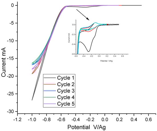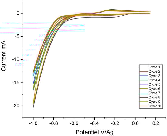 The analysis of the recorded voltammograms shows that the electro-reduction of NR occurred at around—0.1 V/Ag (Figure 14). The evolution of the observed current leads to the formation of a multilayer, and thus to the passivation of the stainless-steel surface. The observed decrease in the current was related to the formation of an insulating film that passivated the surface of stainless steel.
