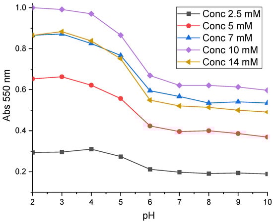 Figure 6 shows the UV-Visible characterizations carried out in buffer solutions ranging from pH 1 to pH 10. In this figure, the optical response of NR measured was related to the total quantity immobilized on the metallized glass plate. Thus, the absorbance of grafted NR increases as a function of the initial concentration up to a limiting value of 10 mM. The value of 10 mM can therefore be considered as the optimum concentration. However, at higher concentrations, such as 14 mM, too many radicals were generated in the reaction medium. The radical polymerization reaction takes place in solution rather than on the surface. The radicals that were formed dimerized in solution. The kinetics of this reaction varies quadratically with the concentration of these radicals. As a result, as the initial NR concentration increases, reactions in solution are favored, increasing the physisorbed portion of the coating. This results in the loss of radicals available for grafting. Dimerization products physisorbed on the surface were removed during the washing protocol. This may explain the lower quantity of 14 mM NR grafted on the metallized glass plate.