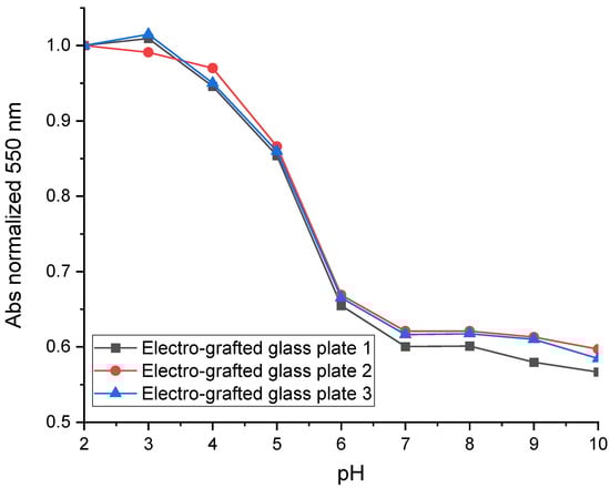 The reproducibility of NR grafting onto metallized glass plates is studied. Three different metallized glass plates from the same batch were grafted with 10 mM of NR (Figure 8). In order to compare the results, absorbances measured at 550 nm for each grafted glass plate were normalized by the absorbance obtained at pH 2 for each grafted glass plate. The results obtained show that the spectral response of these three grafted glass plates is reproducible.