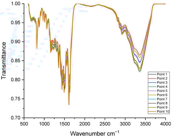 The metallized glass plate grafted with 10 mM of NR was characterized by IR-ATR. On this grafted glass plate, 10 different locations were analyzed (Figure 10). The IR-ATR spectra obtained at these different points are almost identical. We can therefore conclude that the grafted NR organic layer is homogeneous.