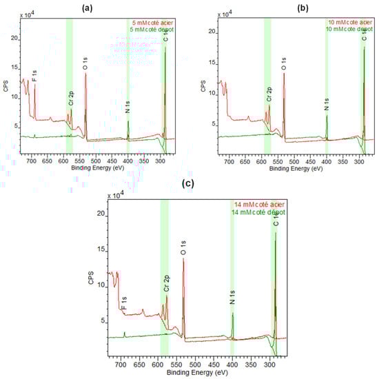 For the first two samples grafted with NR (5 and 10 mM), the signal of the metal substrate, in particular, that of Cr, is visible, which is not the case at 14 mM. XPS allows the analysis of only about the first 10 nanometers of the sample. This characterization confirms the presence of a thick organic layer of NR on the surface of the stainless steel with a thickness greater than 10 nm for the concentration of 14 mM. The film grafted with NR at 14 mM therefore appears thicker. At this concentration, the thickness estimated by profilometry is close to 100 nm.
