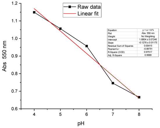 The absorption spectra data processing at 550 nm makes it possible to plot the absorption variation curve as a function of pH (Figure 13). The shape of the experimental curve can be modelized with a line of equation y = (−0.1)x + 1.27, where x is the pH value and y is the optical density measured in the sample. This line has a regression coefficient (0.98) and a slope of −0.1 per pH unit. It is important to note that NR grafted on the metallized optical fiber has a pH range between 4 and 8, while that obtained on the metallized and grafted glass plate varies between 4 and 6. The optical characteristics of grafted NR may therefore depend on the geometry of the electrochemical assembly used.