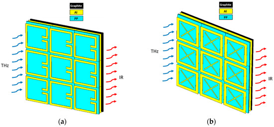 THz-to-IR converter array structures (thickness of Al, PP, and graphite are 0.4 µm, 20 µm, and 10 µm, respectively): (a) SRR; (b) cross-shaped structure.