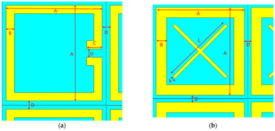 SRR structure is polarization-sensitive, so a co-polar field illumination (E field is perpendicular to structure gaps) is used in the simulations. The simulations are performed using the frequency domain solver for the 0.1–500 GHz region, where atmospheric absorption is negligible, with the E-field in the x-direction with a high resolution of 0.5 GHz in order to effectively simulate the obtained temperature difference for THz sources with narrow emission bands. The transmission is negligible and the absorptivity (ηTHz) from the S11 and S21 values are calculated as ηTHz =1 − |S11|2 − |S21|2. The simulated results are shown in Figure 4 for both structures.