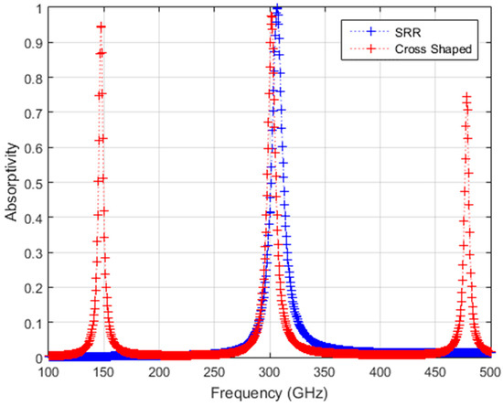 Calculated absorptivity (ηTHz = 1 − |S11|2 − |S21|2) from CST simulations for SRR and cross-shaped structures.