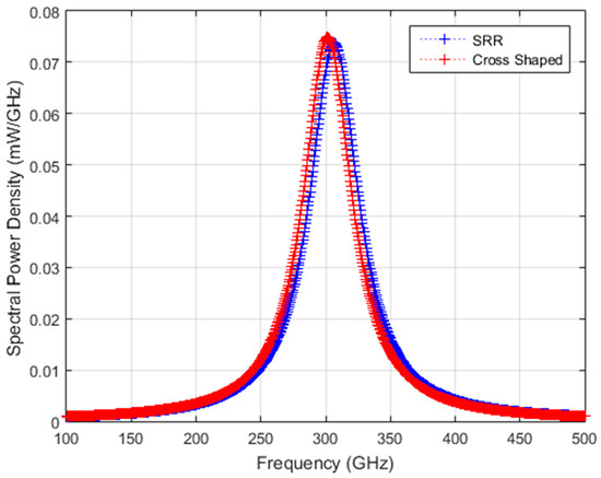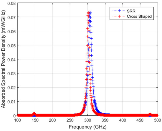 Due to multiple gaps inside the cross-shaped structure with the outer ring, multiple resonances are expected compared to the SRR case, and this can be seen from Figure 4 where three resonance frequencies are clearly seen in the 0.1–500 GHz region. It is important to note that the bandwidth of the source used for subsequent calculations is not affected by the two absorption resonances to the left and right of the center resonance. To compare the cross-shaped structure with the SRR structure, we took only the resonance near 300 GHz in the following heat transfer analysis. From these simulations, an absorptivity, ηTHz, of 0.976 is found for the cross-shaped structure at 301.5 GHz, while an absorptivity of 0.997 is found for the SRR structure at 306.5 GHz, and this agrees with the MS simulation results for the SRR structure for the same geometrical parameters reported previously [1,2].