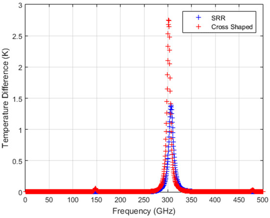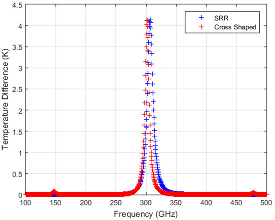 As can be seen in Figure 7, these results show that both converter structures give similar performance for linearly polarized illumination at 301.5 GHz and 306.5 GHz resonance frequencies, with 4.157 K and 4.130 K peak ΔT values for the SRR and cross-shaped structures with an area of 1 mm2, respectively. Since commercial state-of-the-art IR bolometer cameras can have NETD values on the order of 3 mK, the calculated ΔT values are well above the limit of the IR bolometer camera NETD values.