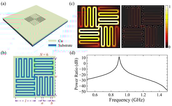 (a) Structural diagram of the miniaturized cross-meandering resonator. (b) Top view and geometric parameters of the resonator. The length and width of meandering gaps, the width of the meandering strips, and the number of corners and the size of the resonant element are denoted by l, a, b, N and w, respectively. Here, the number of corners, which refers to the number of bends in the resonator branches (green line marks), is N = 6. (c) Field distributions (|E|) of the resonator at the frequency of 900 MHz and 1000 MHz. (d) Power ratios of the cross-meandering resonator based on a full-wave simulation.