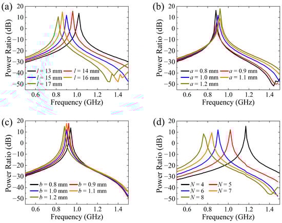 Next, the properties of the cross-meandering resonator with changes to its geometric parameters are investigated in detail. The calculated power ratios as functions of the length (l) and width (a) of meandering gaps, the width of the meandering strips (b), and the number of corners (N) are displayed in Figure 2a–d. According to the transmission-line theory [31,32,33,34], the resonance frequency is inversely correlated with the equivalent inductance and capacitance of the cross-meandering resonator [35,36]. As shown in Figure 2a, with the increase of the length of the meandering gaps, the resonance frequency shifts from 1.02 GHz to 0.81 GHz due to the increment of the equivalent inductance of the resonator. As the width of the meandering gaps increases from a = 0.8 mm to a = 1.2 mm, the resonance frequency rises by 0.04 GHz (Figure 2b), because the equivalent capacitance of the resonator reduces slightly. Correspondingly, with the growth of the meandering strips’ width, the resonance frequency declines a little owing to the additive equivalent capacitance (Figure 2c). When the number of corners changes from N = 4 to N = 8, the resonance frequency of the structure decreases dramatically because of the incremental equivalent inductance, as depicted in Figure 2d. In comparison, the length of the meandering gaps and the number of corners have more influence on the resonance frequency of the cross-meandering resonator. Overall, the resonance frequency of the structure can be flexibly adjusted by varying the geometry parameters, so that the designed resonator can be readily adapted to different frequency ranges to meet diverse application demands.