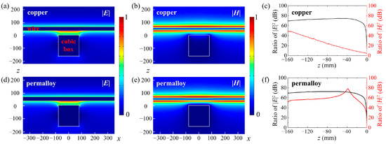 The simulated electric field and magnetic field distributions are displayed in Figure 3a,b. It is observed that the electric field intensity inside the cubic box decreases sharply, while the magnetic field intensity is relatively gradually decreased. Taking the distributions of electric field and magnetic field without the cubic box as a reference, the calculated ratios of |E|2 and |H|2 are as shown in Figure 3c. The shielding effect of the resonator composed of copper material on the electric field (black line) is better than that on the magnetic field (red line). At z < −5 mm, the shielding’s effectiveness on the electric field is greater than 60 dB. To improve the ‘s effect on the magnetic field, the material of the resonator layer can be changed to permalloy. The simulated results are displayed in Figure 3d–f. It can be seen that the shielding effect of the resonator on the power frequency magnetic field has been significantly improved. The shielding effectiveness on both the electric field and magnetic fields exceeds 50 dB at z < −13 mm.