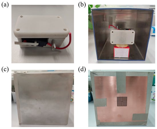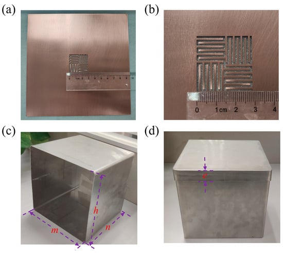 To experimentally verify the functionality of the proposed cross-meandering resonator, the structure is etched in a 1 mm thick copper film using wire electrical discharge machining (WEDM). Figure 4a shows a photograph of the fabricated sample. The overall size of the sample is about 164 mm × 164 mm (~0.49λ0 × 0.49λ0). A detailed size comparison can be seen in Table S1 of the Supplementary Materials. A zoomed-in view of the resonator is displayed in Figure 4b. The measured geometrical parameters of the resonator are as follows: w = 28.95 mm, l = 14.95 mm, a = 0.95 mm, b = 1.05 mm. To test the shielding efficiency and wireless signal transmission of the sample, we customized an open side shielding box and a rolled-up lid, as depicted in Figure 4c,d. Here, the box and lid are made of permalloy, due to its high permeability at the power frequency, and the thicknesses are both 1 mm. The dimensions of the shielding box and lid are m = h = n = 160 mm, e = 10 mm.