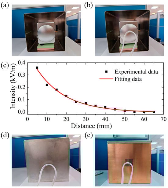 (a) Power frequency electric field shielding performance measurement setup. (b) Measured photograph when the electric wire is close to the sensor. (c) Measured electric field intensities at different distances (black dots). The red line indicates the fitting curve. Measured photographs when the electric wire is close to the (d) permalloy lid and (e) cross-meandering resonator sample.