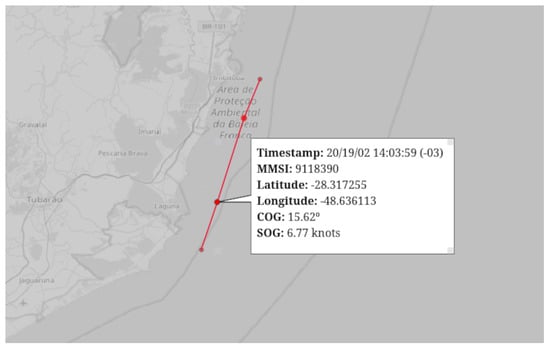 The malicious alteration of AIS data transmitted by vessels themselves to disguise their identity or location, known as spoofing, has been demonstrated as possible in various studies [,]. This practice can mask or facilitate illegal activities, disrupt monitoring systems, and create navigation risks. Some studies have attempted to detect AIS spoofing, such as [,,]. In [], an architecture was proposed to detect AIS data spoofing in an online data stream. The architecture stores the vessel’s MMSI in a hash, and for each associated trajectory it computes the haversine distance between consecutive points and the average speed. If the average speed exceeds 50 knots, the trajectory is considered spoofed. Figure 3 shows an example of spoofing. The vessel’s AIS reports an SOG of 3.2 knots, but when we calculate the speed based on latitude, longitude, and timestamp positions we obtain a speed of 92 knots.