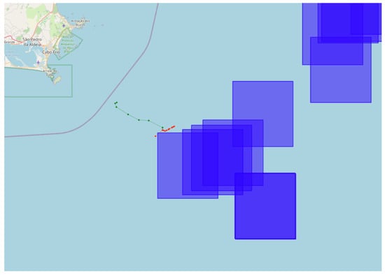 In the literature, we found a variety of attempts to solve this problem, mainly by using active sensors for detection. For non-collaborative systems, works such as [,] used radars, which, when fused with AIS, have both AIS and radar trajectories associated, and an anomaly can be detected if they diverge. Other works attempted to solve the problem using only the AIS sensor [,]. However, using only the AIS sensor, we can detect transmission gaps in the trajectory and assume that the vessel may have turned off the AIS transponder. Figure 5 shows an example of trajectory gaps. The blue points represent where the vessel transmitted the AIS signal. The green squares represent regions where the vessel transmitted within the area, while the red squares indicate transmission gaps, meaning the vessel should have transmitted within that region.