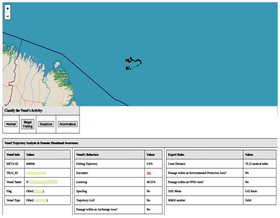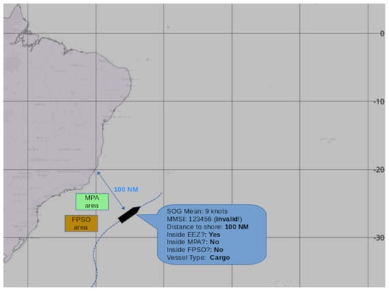 In various maritime domain monitoring systems, it is common to use sets of knowledge-based rules developed by experts in the field. These rules are formulated based on years of experience and deep knowledge of navigation patterns, expected vessel behaviors, indicators of suspicious activities, and laws. Knowledge-based rules are typically created to identify deviations from normal maritime operation patterns. They cover a variety of criteria, such as unexpected trajectories, anomalous speed variations, the use of invalid identifiers (MMSI), and behaviors indicative of spoofing or illicit operations. Kinematic behaviors refer to a vessel’s movement pattern, including aspects such as speed, direction, and any changes in its course or speed over time []. Some agencies, such as the European Maritime Safety Agency (EMSA) [], have models called Automated Behavior Monitoring (ABM). Examples of behaviors can be seen in Figure 7. The figure shows some rules created by experts, such as entry into MPA and FPSO areas, validity of the MMSI number, entry into the EEZ, etc. The goal of ABM is to automatically detect and highlight vessel behaviors that may be of interest or concern. However, excessive use of such rules can become impractical because specialists need to verify each rule trigger. Therefore, in maritime monitoring systems, it is simple to create thousands of kinematic rules, with the operator responsible for verifying each trigger and updating these rules.