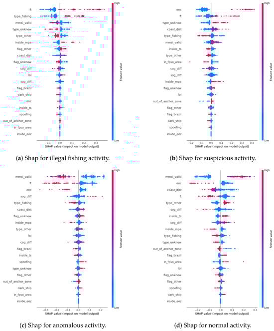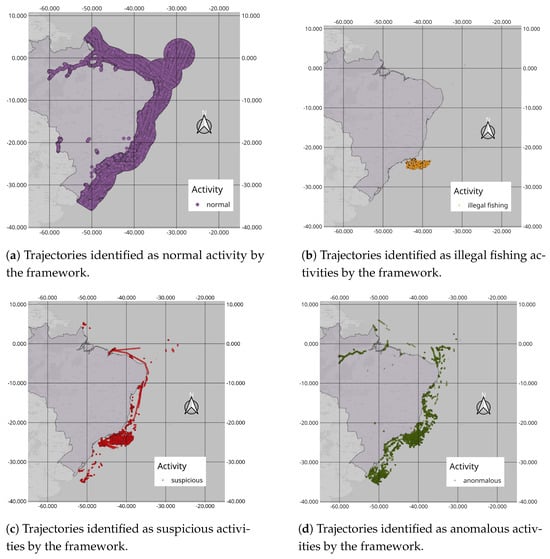 Throughout the tests, our framework, trained with synthetic datasets, successfully identified real cases of vessels involved in suspicious encounters, as well as foreign vessels seemingly fishing within Brazil’s Exclusive Economic Zone (EEZ). This demonstrates that our framework for detecting illegal vessel activities is both viable and flexible in terms of adding new behaviors and activities, and it significantly reduces the number of trajectories that require expert attention.