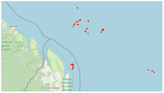 Through Maritime Domain Awareness (MDA), MAs can monitor their Exclusive Economic Zones (EEZs) to ensure safe maritime traffic and the economic exploitation of the coast by the country []. To improve maritime traffic security, it is essential to strengthen intelligence processes in maritime surveillance. Detecting illegal activities carried out by vessels is crucial for enhancing navigation safety, as well as improving the efficiency and protection of maritime operations []. The detection of navigation behaviors such as fishing trajectories, loitering, spoofing, encounters (or rendezvous), and dark ships is essential for situational awareness and, consequently, for the detection of illegal activities [].