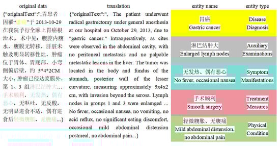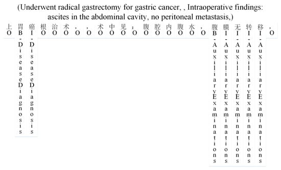 A preprocessing strategy is designed for Chinese electronic medical texts, which encompasses the redefinition of entity types, the removal of outliers and invalid characters, and the supplementation of incomplete sentences. By analyzing the relevant medical proprietary terms involved in the patient’s treatment process, five entity types are redefined as: disease diagnose, auxiliary examination, symptom manifestation, treatment measure, and physical condition. Subsequently, invalid characters, such as spaces, newline characters, or garbled text from the dataset are eliminated, as they could potentially affect the model’s recognition accuracy. Following that, data desensitization is performed to exclude any sensitive information, such as patient names or medical identification numbers. Finally, we augmented sentences that were either incoherent or incomplete. For example, in cases where there is a lack of descriptive modifiers for a patient’s mental, dietary, or sleep conditions, it is modified to ’normal’ if the patient’s postoperative condition is favorable, or modified to ’average’ if the postoperative recovery is less favorable. Adhering to these strategies, we annotated the entity types in the data, performed validation checks, and finally generated an output text dataset.