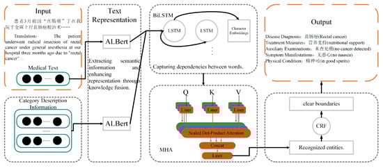 Inspired by the BERT and LSTM models, we propose a novel network model, which we call ALBERT-BiLSTM-MHA-CRF. The architecture of the proposed model is illustrated in Figure 4.