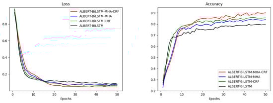 As a result of the variation graphs, it may be inferred that the proposed ALBERT-BiLSTM-MHA-CRF network has advantages over the other three models in terms of loss function and accuracy. Note that all four models show a rapid decrease in the loss function and significant increase in the accuracy for relatively low values of epoch numbers. As the epoch number increases, the ALBERT-BiLSTM-MHA-CRF model exhibits lower loss function values and higher accuracy in comparison with other models. This indicates that the number of iterations in BiLSTM and MHA modules play a crucial role in performance of the model.