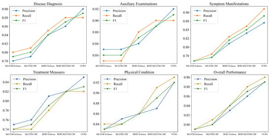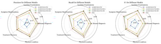 Based on the comparative experimental results from Table 7 and Figure 10, the ALBERT + BILSTM + MHA + CRF model demonstrates significant advantages in named entity recognition tasks. Compared to other models, such as the BiLSTM + Softmax model, this model shows notable improvements in P, Recall, and F1-Score. Specifically, for the key entity types “Disease Diagnosis”, “Symptom Manifestation”, and “Treatment Measures”, the F1-Score of this model are increased by over 0.10. These improvements are attributed to the strong representation capabilities of the ALBERT pre-trained model, the context modeling ability of MHA, and the precise boundary prediction provided by CRF, which effectively addresses issues related to varying meanings of the same entity in different contexts and fuzzy entity boundaries. However, it is noteworthy that, despite the overall superior performance of the model, the recognition performance for the “Treatment Measures” category remains suboptimal, with an F1-Score of only 0.83. This indicates that challenges persist in processing entities of this category, and further research is needed to enhance the accuracy of recognition for this type of entity, thereby improving the model’s performance across all entity categories.