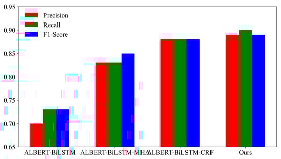 To verify the effectiveness of each module of the model, ablation experiments were designed to compare the model with the ALBERT-BiLSTM, ALBERT-BiLSTM-MHA, and ALBERT-BiLSTM-CRF separately, aiming to validate the performance of the MHA and the CRF module.
