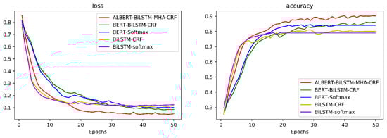 To further validate the effectiveness of the model, a comparative experiment is designed to compare the model with BERT-BiLSTM-CRF [35], BERT-Softmax [36], BiLSTM-CRF [37], and BiLSTM-softmax [38]. The loss and accuracy variation curves for the five models at each training epoch are shown in Figure 9.