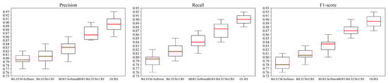 During the modeling process, the results of each model run may vary due to randomness. To compare the stability of different models, the precision, recall, and F1-Score of the five models are calculated for each fold in a 10-fold cross-validation. Box plots were then generated, as shown in Figure 11, to visualize the distribution of these metrics across the folds. The upper and lower whiskers represent the range of the data, the height of the box reflects the dispersion of the data, with a shorter box indicating that the data is concentrated and has low variance, and the median line indicates the median of the metric. According to the graph, it can be observed that the precision, recall, and F1-Score of the proposed ALBERT-BiLSTM-MHA-CRF model in the 10 test sets are all within the upper and lower limit ranges, with no outliers, and the data distribution is relatively concentrated. This indicates that there is not much variation in the results during the 10-fold cross-validation, and the proposed ALBERT-BiLSTM-MHA-CRF model is relatively stable, making it suitable for predictive analysis in Chinese electronic medical records.