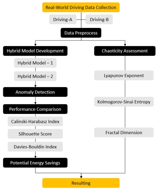 Two hybrid models were developed for unsupervised anomaly detection based on real-world driving data. To evaluate the performances of the models, an electric vehicle was driven twice under the same conditions and the CAN bus data were recorded. CAN records were preprocessed to make them suitable for hybrid models. Hybrid models were created with the LSTM-Autoencoder, LOF, and Mahalanobis distance sub-methods. The silhouette score, Davies–Bouldin index, and Calinski–Harabasz index were calculated for the anomaly detection performance evaluation. Excessive energy consumption caused by detected anomalies was calculated. In parallel, the Lyapunov exponent, Kolmogorov–Sinai entropy, and fractal dimension were calculated to evaluate the chaoticity of the driving data. At the end of this flow, it was revealed that there was a relationship between anomaly and chaoticity, and the anomaly detection outputs were strengthened. The flow of the study is seen in Figure 1.