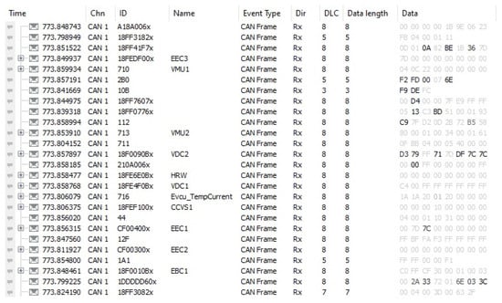 Two different real-driving datasets were used to develop the anomaly detection models. The datasets were obtained as a result of two different people driving a battery electric vehicle suitable for urban use under the same environmental conditions. The hexadecimal-based CAN bus data transferred via the vehicle’s OBD-II port while driving were converted to a CSV file via the VECTOR tool. The preprocessing process for the anomaly detection model was started by extracting vehicle speed, acceleration, throttle ratio, motor torque, and motor power data from the data obtained with a 0.01 s step interval. A scope from the CAN recording while driving can be seen in Figure 2.