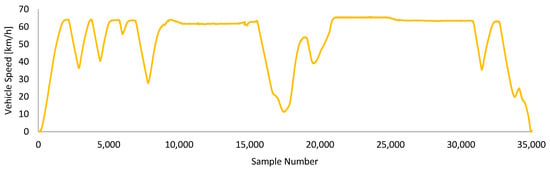Figure 3 is the speed graph of the first drive called “Driving-A”. Instead of creating a crowd by sharing the graph of the entire recorded dataset, only the speed graph is shared to represent the driving. These drive data have 35,000 points and include semi-city and semi-highway driving. The vehicle started to move from rest. There was no wind in the driving environment and the ambient temperature was approximately 15 °C. The road occasionally contained slight potholes and bumps. The total energy consumption for this drive was measured as 1.7055 kWh.