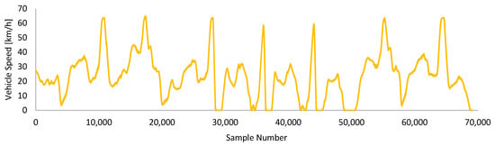 Figure 4 is the speed graph of the second drive called “Driving-B”. For this driving dataset, only the speed graph is shared to represent the driving. This drive has 70,000 points and represents mostly urban driving. Frequent stop-start and harsh braking are the majority. Driving-B was made on the same route as Driving-A and was in the same environmental conditions. During this drive, the vehicle consumed 0.1129 kWh of total energy.