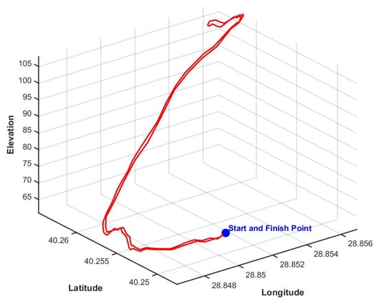 Figure 5 provides a three-dimensional visual of the route the battery electric vehicle was driven during the data collection process. The visual was obtained by creating the driving route on a browser-based public platform [26], obtaining the .GPX file, and converting it to the appropriate format in MATLAB R2022b.