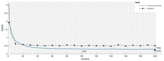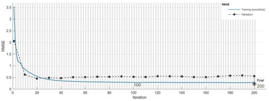 In the LSTM-Autoencoder model, the hyperparameters were carefully selected to balance the learning efficiency and model complexity. The decision to use 64 neurons within the LSTM layers was made to provide a sufficient level of complexity, ensuring the model could capture essential patterns in the data without leading to overfitting or excessively long training times. Although a larger number of neurons could enhance the model’s capacity, it also risks diminishing returns by increasing the potential for overfitting. The number of epochs was set to 200, which allowed the model to learn effectively from the training data. This choice was supported by the root mean square error (RMSE) graph, which showed stability well before reaching 200 epochs, indicating that this number of iterations was adequate for preventing overtraining. A batch size of 64 was chosen to balance the memory usage with the training efficiency, allowing for effective weight updates while managing the memory consumption and promoting a stable learning process. A dropout rate of 20% was applied, where 20% of the neurons were randomly disabled during each training step to prevent overfitting, a technique widely supported by the literature for its effectiveness in similar contexts. The initial learning rate was set at 0.01, a common choice that balances the trade-off between the convergence speed and model accuracy. Higher learning rates might hinder the model from reaching an optimal solution, while lower rates could unnecessarily prolong the training process. The Adam (Adaptive Moment Estimation) optimization algorithm was selected for its robust performance across various deep learning applications. Additionally, gradient clipping was applied with a threshold of 1 to maintain stability during the learning process, preventing any gradient from exceeding this magnitude and thus avoiding instability. A validation frequency of 10 was set to ensure that the model was tested against the validation set every 10 steps, allowing for the timely monitoring of the validation performance and the early detection of overfitting. The combination of these hyperparameters facilitated a well-balanced learning process, enabling the model to achieve satisfactory accuracy within a reasonable training duration.