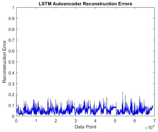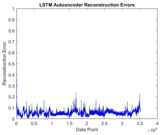 The visual of the error values that emerged at the end of the post-training reconstruction process of the LSTM-Autoencoder model is shared in Figure 7. When the overall data are evaluated, the average error rate is around 0.06.