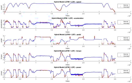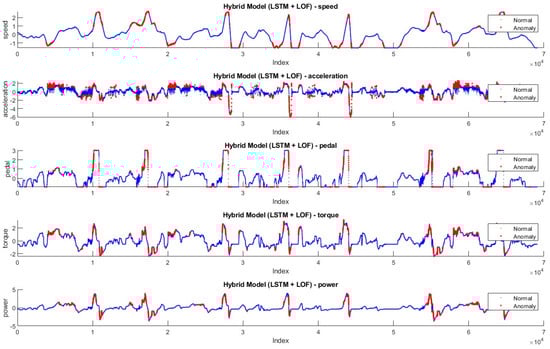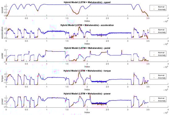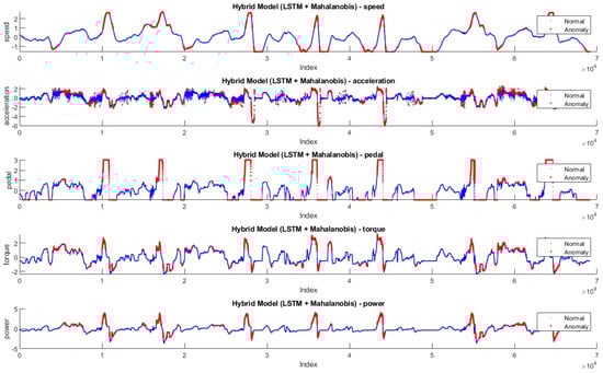 Figure 12 and Figure 13 show the anomaly distribution in the Driving-B data according to Hybrid Model-1 and Hybrid Model-2. Similar to the threshold approaches preferred in the Driving-A data, the anomaly values are in red, and the normal values are blue dots. Since this drive represents city driving with frequent stop-and-go, the data characteristics show more fluctuation. Sudden changes throughout the anomaly detection are labeled as anomalies.