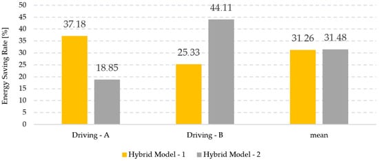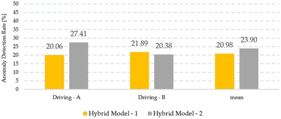 Figure 14 and Figure 15 provide a general visualization of the study results. In Figure 14, the anomaly detection performances of the hybrid models in the driving data are shared with their average rates. In Figure 15, the excessive energy consumption rates caused by the anomalies detected by the hybrid models are presented with their average values. Looking at the average ratio columns, it is seen that the energy-saving performance of Hybrid Model-2 is similar to that of Hybrid Model-1, but when the same evaluation is made for the anomaly detection performance, Hybrid Model-2 has a higher performance. Since this study focused on anomaly detection and there was no significant difference in energy savings, it was decided that Hybrid Model-2 was superior.