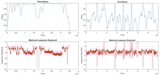 Chaoticity assessment was conducted with the methods preferred in the literature. The Maximal Lyapunov Exponent [23] is one of the most widely used metrics in analyzing chaotic systems and is considered a standard method in time series analysis. The negative value of the lambda value calculated in this method indicates that the system is dynamically stable, the zero value indicates that the system is orderly and neutral, and the positive value indicates that a chaotic system exists. The basic calculation for the Lyapunov Exponent is given in Equation (11):