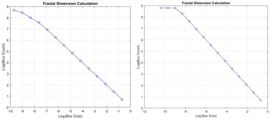 The fractal dimension [42,43,44] is used to understand the complexity and self-similarity of data models. The box-counting dimension calculates the fractal dimension by dividing the dataset into boxes. It is the most common, easy to calculate, and widely accepted method in time series analysis. This method is widely used to identify fractal properties of data and is ideal for measuring complexity in time series data. If the fractal dimension result is less than 1, the structure considered is in one dimension and shows straight-line behavior; if it is between 1 and 2, it means that it is two-dimensional, like a curve or surface, but does not fill a completely two-dimensional area; if it is between 2 and 3, it looks like a surface but has three dimensions. It does not fill a three-dimensional volume, and the fact that it is greater than 3 indicates that a structure that is complex enough to cover a four-dimensional space has been formed. When calculating the fractal dimension with the box-counting method, a grid of different scales (from small to large) is applied to the fractal shape under examination. At each grid scale, the filled boxes on the fractal shape are counted. The numbers of filled boxes corresponding to different grid scales are plotted on the log-log plot. The slope of the log-log plot gives the fractal dimension. The fundamental formula required for box-counting dimension calculation, the sub-method used in fractal dimensioning, is given in Equation (16). In Equation (16), D is the fractal dimension, is the box dimension of the grid, and N is the full box number: