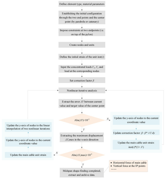Determining the reasonable state of the mid-span main cable is the most critical step in the algorithm. The mid-span main cable has a well-defined rise-to-span ratio, and the general idea of shape-finding is to solve for stress-free shapes that satisfy the geometric convergence objective under bridge loading. With the powerful geometric nonlinearity function of Ansys, this module is based on the loop adjustment, and the flow chart is shown in Figure 1. The main cables are usually assumed to be flexible rods subjected to tension only. Two endpoints and a center point are used to control the shape, which does not change with the nonlinear iterative process. Then, longitudinal displacement constraints are added at the two endpoints, and the remaining nodes can be modeled initially based on parabolic or catenary curve interpolation. The self-weight of the suspenders, the weight of the cable clamps and the tension of the suspenders are applied as a concentrated load on the IP points of the main cable. The initial strains of the elements are given by Δ/l, where Δ is the difference between the length of the element, l, and the length of the zero strain. The initial strain reflects the internal stresses of the element at the modeled length, as shown in Equation (1).
