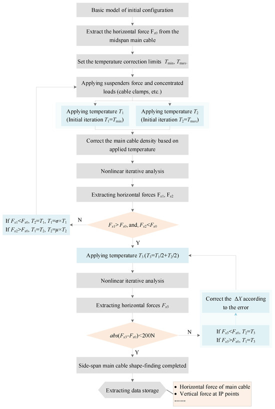 The apparent stress-free state of the main cable at the side span is the initial configuration of the model or the corrected model after the procedural solution; however, this does not reflect the true stress-free length, which contains temperature corrections to satisfy the convergence criterion. The temperature is a correction value introduced by the programmed simulation of the unstressed length, which does not exist in the real situation. For the side span, the unstressed length accounted for by the procedure is objectively increased, and the gravity of the structure is increased accordingly. Therefore, the density of the main cable is corrected according to the principle of quality conservation based on the temperature correction value to ensure the high accuracy of the calculation results. The flowchart for shape-finding and force-finding for side-span main cables is shown in Figure 2.