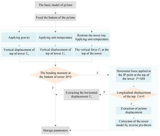 For single-span suspension bridges, the maximum and minimum bending moments of the pylons are extremely unbalanced in the operating condition. In this case, it is an economically feasible strategy to control the bending moment in the longitudinal direction of the pylons by applying it in the completed bridge state. There are two ways to apply the pylons to control the bending moment in the longitudinal direction, and the difference is whether the pylons are kept in a vertical position. If the control target is vertical, the pylons must be pre-offset, and the value and law of the pre-offsetting are determined by the stiffness of the pylons and the bending moment of the control target. It is necessary to redefine the side-span shape-finding of the main cable. The application of the control moment in the longitudinal direction of the pylons in the completed bridge state is essentially the control of the unbalanced horizontal force ΔF of the side- and mid-span main cable. In the process of shape-finding of the main cable at the side span, it is sufficient to modify the convergence target value. The pylon model needs to be pre-offset according to the induced deformation. In the case of pre-deflection of the pylons of the bridge control target, the initial model of the pylons does not need to be corrected, and only the value of horizontal displacement at the top of the pylons needs to be extracted for the correction of the main cable shape-finding. The control bending moment at the base of the pylons is determined, the unbalanced force on the main cable at the top of the pylons is also well-defined, and the horizontal displacement ΔX determined by the stiffness of the pylons can be obtained. The spans of the side- and mid-span main cables are essentially changed, and the effect of ΔX needs to be superimposed during shape-finding. The flowchart of the pylons’ modeling procedure is shown in Figure 3. After applying gravity, pre-throw height and ΔF loads, the force is connected with the main cables and the ΔF loads are removed from the pylons.
