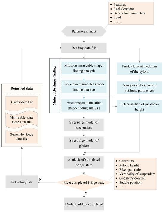 The core idea of Ansys-based suspension bridge modeling is to establish a nominal stress-free state model, and after the construction process until the bridge load condition, the various geometric and internal forces meet the requirements of the completed bridge state. The reason why it is called a nominal stress-free state model is mainly based on the technical means (e.g., side-span temperature corrections) used in the modeling process. This enables the unit lengths to have a temperature correction term superimposed on the unstressed state. The aforementioned content introduces the basic process of modeling. Since the iterative shape-finding and solution are completely based on the finite element method, the process is relatively simple, and the result is intuitive, which is easier to be accepted and understood by engineers, and the problems in the solution process are easier to be found and understood [9,27]. The stress modeling process is given in Figure 4. The whole process is based on the structural stress characteristics and properties of the suspension bridge. The solution and shape-finding, however, are prepared according to modularity and are, therefore, generalizable.
