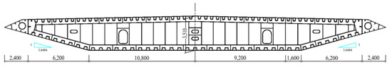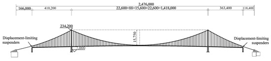 The Nanjing Qixiashan Yangtze River Bridge is an asymmetric three-span continuous suspension bridge with a main span of 1418 m, and the distance between the IP points of the north and south anchorages is 2476 m. To coordinate the vertical deformation of the girder and the main cable and to reduce the pressure on the bearing of the transition pier, displacement of the main cable is limited by displacement-limiting suspenders at the transition pier locations [1,29]. Figure 5 illustrates the span arrangement of the suspension bridge. The girder is a fully welded, flat, streamlined closed steel box girder with a top width of 38.8 m (including wind nozzles) and a girder height of 3.51 m at the centerline, and the section is shown in Figure 6. The pylon is in the form of a hybrid structure with a concrete material for the main structure and the optimized shaped rigid superstructure (Figure 7). To reduce the wind resistance coefficient and improve the vortex-induced vibration performance, the pylon cross section was notched with a notch size of 1.6 m × 1.0 m. The cross-sectional characteristics of the girders and the pylons are shown in Table 1. The main cable is made of prefabricated parallel wire strands (PPWS). The cross-sectional area and material properties of the main cable and suspenders are shown in Table 2.