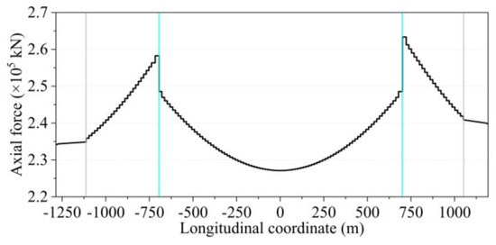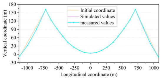 The reasonable completed bridge condition mainly provides a reference for the bridge monitor to track the calculation and error adjustment from the structural construction to the final completed bridge. The goal of monitoring is the designed state of completion. If the target state of the bridge is not consistent, then the monitoring is off course. The iterative computational model in this section is the constant load state computational model of Section 3.2. After repeated iterations and adjustments, the coordinates of the main cable under the dead load state of the bridge are shown in Figure 9. The initial coordinates are calculated from the segmental catenary [10,11]. The results of the acceptance load test of the Qixiashan Yangtze River Bridge were compared and analyzed, and it was found that the coordinates of the main cables obtained from the simulation were basically the same as the measured coordinates of the completed bridge. This validates the effectiveness of the methodology proposed in this study for modeling. The axial force of the main cable obtained from the final iteration is shown in Figure 10. As the spans of the two side spans are not the same, the axial force of the main cable is not completely symmetrical. Among them, the axial force of the main cable near the south pylon is relatively large, approximately 263.34 × 103 kN. Overall, the distribution of the axial force of the main cable is basically in line with the characteristics of the three-span continuous suspension bridge.